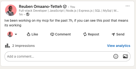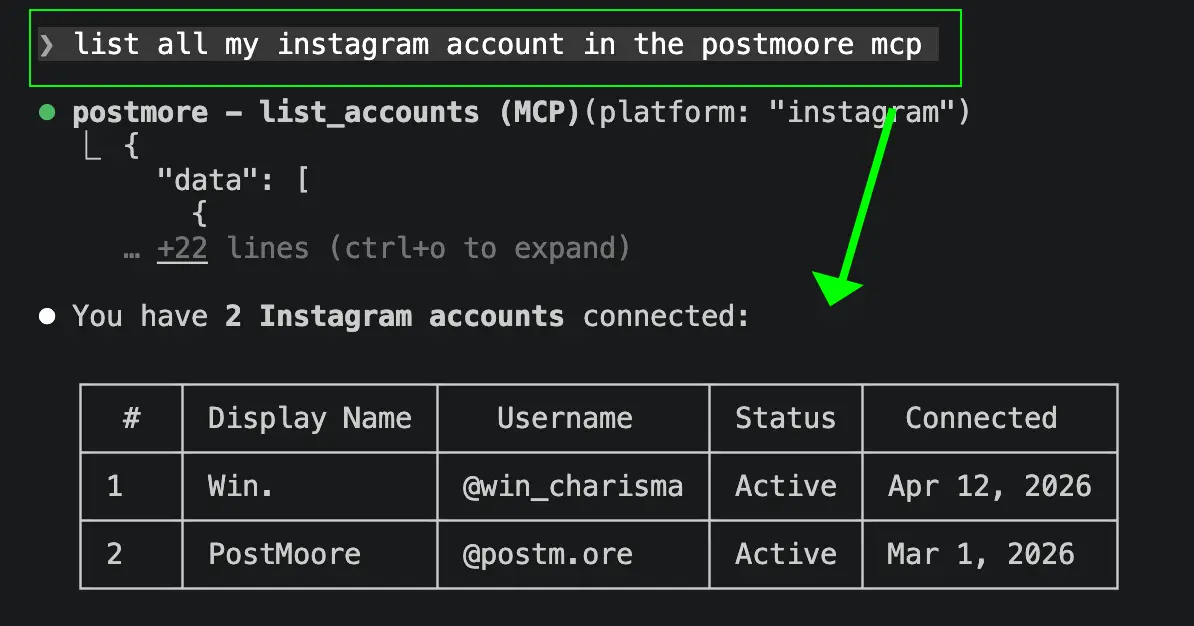 Ask for your connected accounts, check their status, and target specific platforms by name — all from chat.